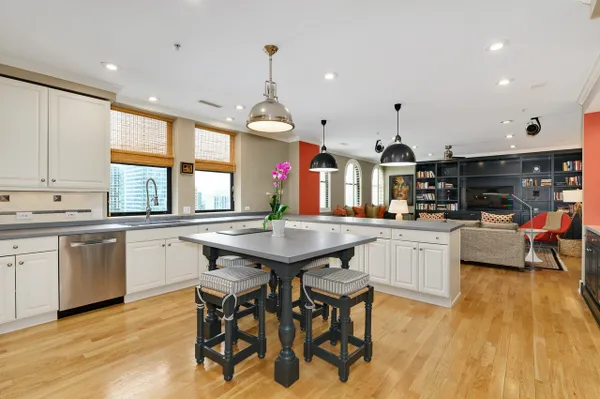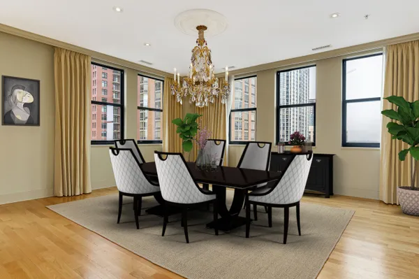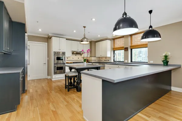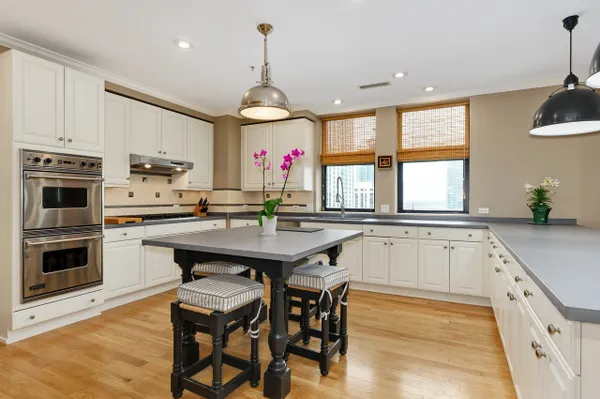Elegant custom beautifully refinished half floor home in highly sought after Gold Coast bldg! This 3 bed/2.1 ba is over 3300 sq ft & lives like a single family. Enter into the warm & inviting foyer that leads to open and formal living rm & dining rm which includes a large balcony spanning 35 ft facing south w/ incredible views! Top of the line chefs kitchen includes all high-end appliances, wine room, concrete counter tops, island & eat-in counter top provides plenty of causal dining & visiting options. The lovely Great Room off of the kitchen makes the home as functional as it is beautiful! Perfect for the entertainer! The large master suite includes a wonderful bath and 2 large walk-in closets. Private 2nd bed w/ lots of additional closet space. 3rd bed offers smart built-in to double as an office. 2 garage side/side heated parking. Bldg offers 24/hr doorperson, exercise rm, bike storage & additional storage. Walk to restaurants, farmers markets, parks, Lake ,The Loop, Oak St & more!